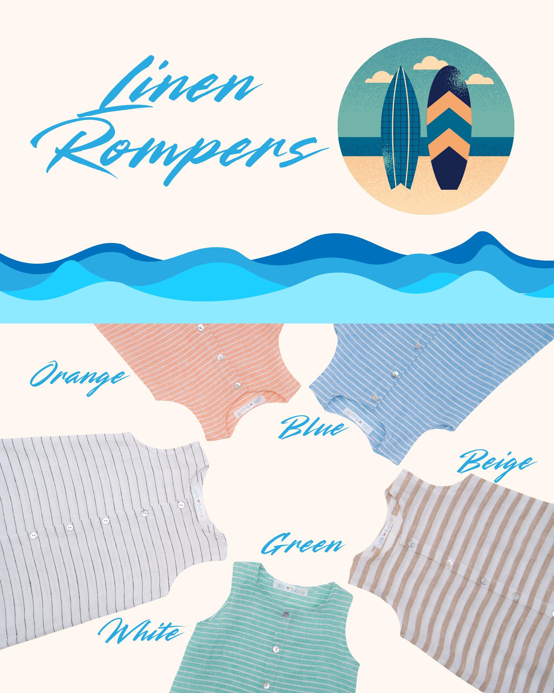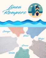 Soft linen rompers in fun colors for both boys and girls. Presko and comfortable for playing indoors, at the park or at the beach.
