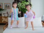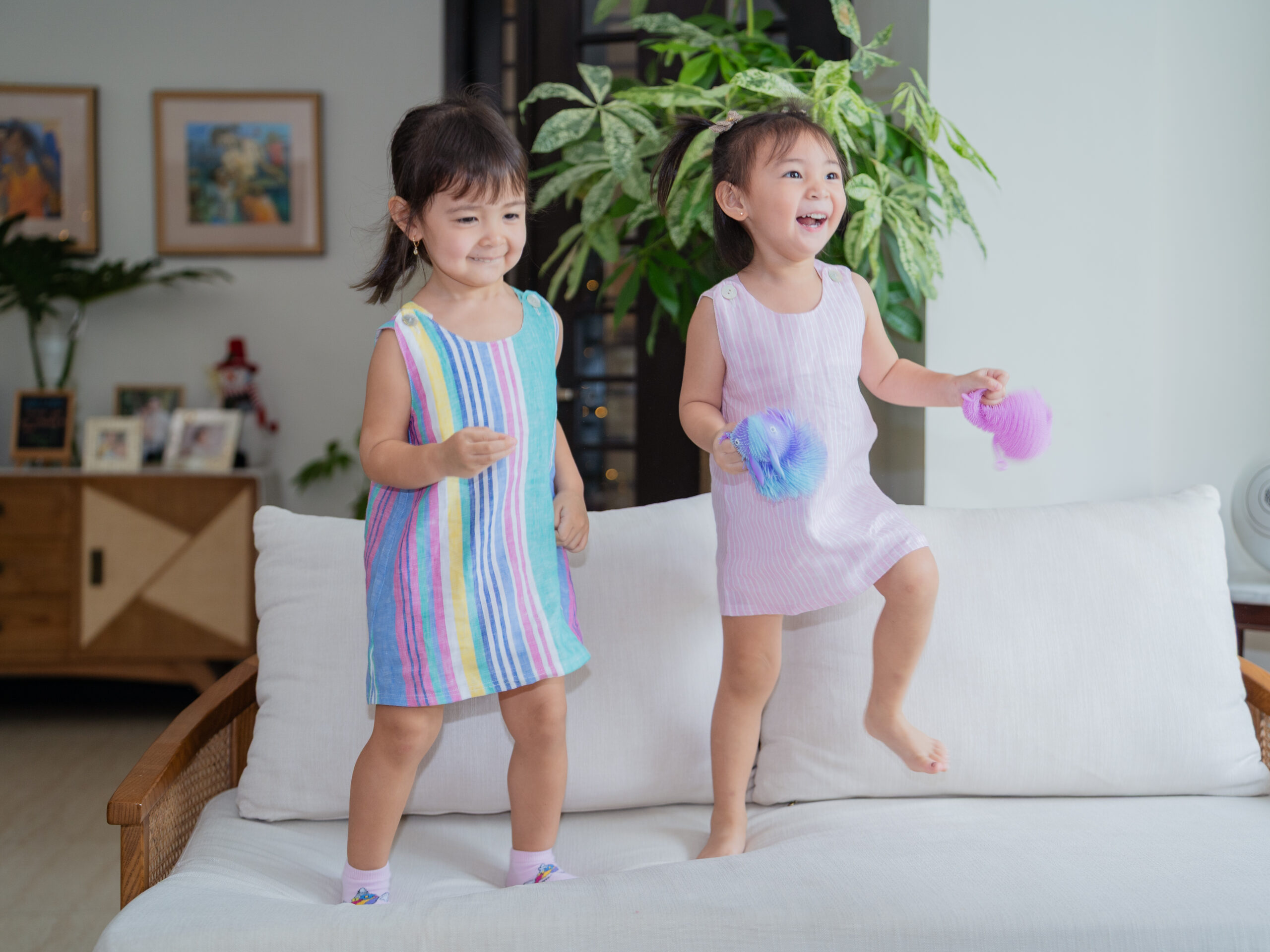 Our linen a-line dress in rainbow stripe design. Lightweight and fun for the girls.